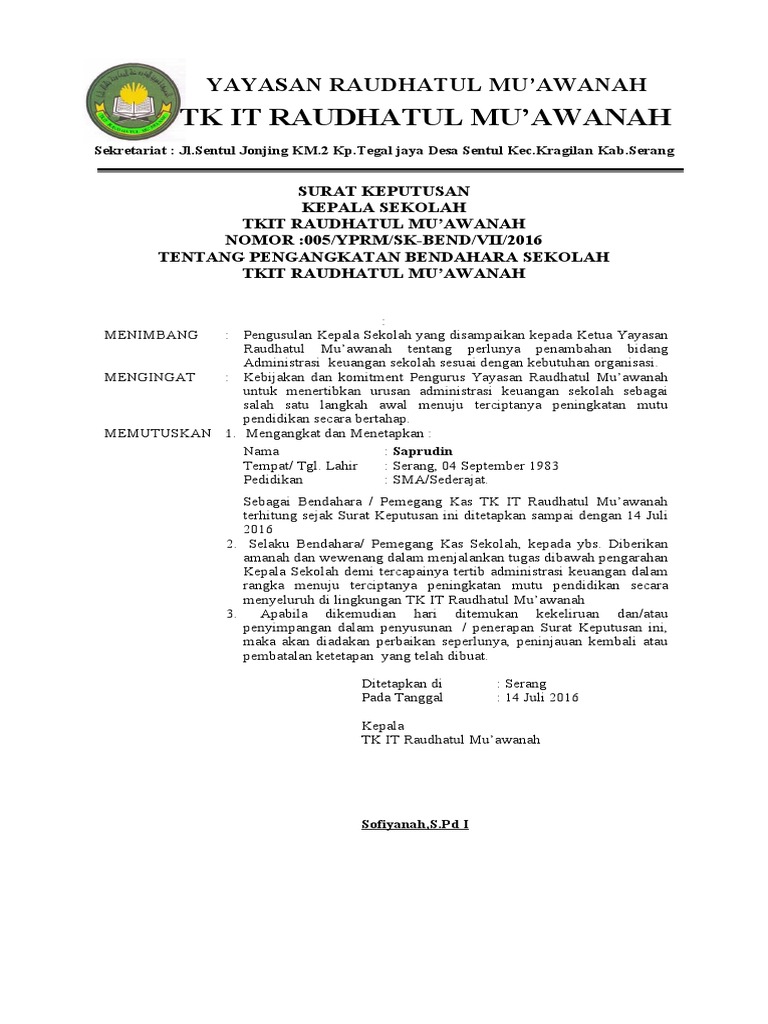 Contoh kalimat sk pengangkatan bendahara bos. 24092020 contoh sk pengangkatan kepala sekolah tk oleh yayasan doc dapatkan contoh. Surat keputusan kepala sekolah bendahara paud. Contoh sk yayasan untuk lembaga guru ilmu sosial. Contoh sk pengangkatan ketua yayasan guru ilmu sosial.