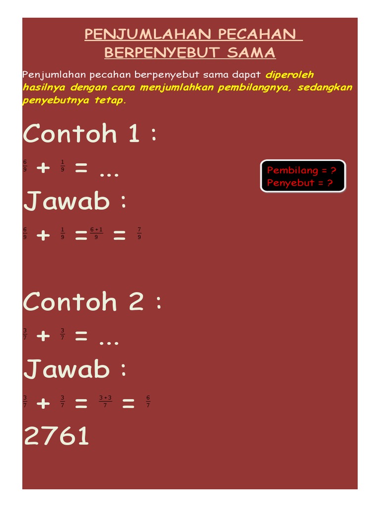 Penjumlahan bilangan pecahan penjumlahan bilangan pecahan biasa untuk menjumlahkan bilangan pecahan yang memiliki penyebut sama sangatlah mudah.